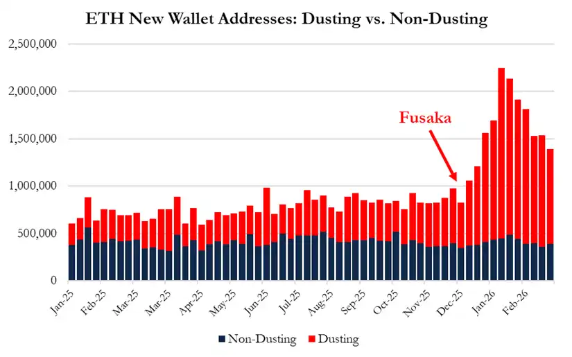 我们对 2025 年 1 月至 2026 年 2 月的链上数据进行了全面分析,结果显示 Lee 所称的「机构采用带来了以太坊的活动增长」,实际上可以用大量低价值的地址投毒(address poisoning)与粉尘攻击(wallet dusting)行为来解释。这些行为是 Fusaka 升级后区块空间过剩所引发的。