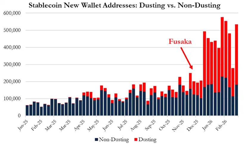 · 95% 的新钱包增长来自新创建的粉尘地址;