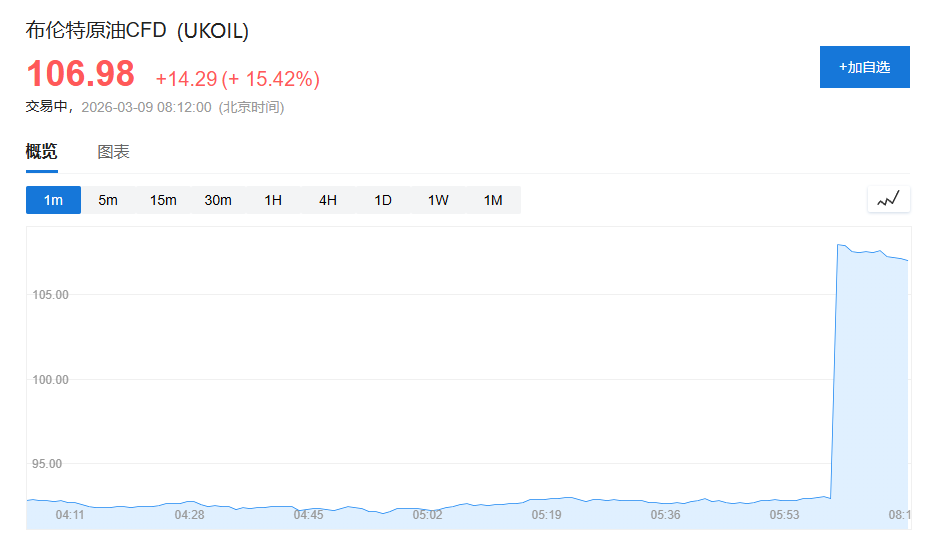 WTI原油期货一度大涨22%,突破110美元关口;布伦特原油期货也大涨20%,至每桶111.04美元。随后涨幅有所回落。