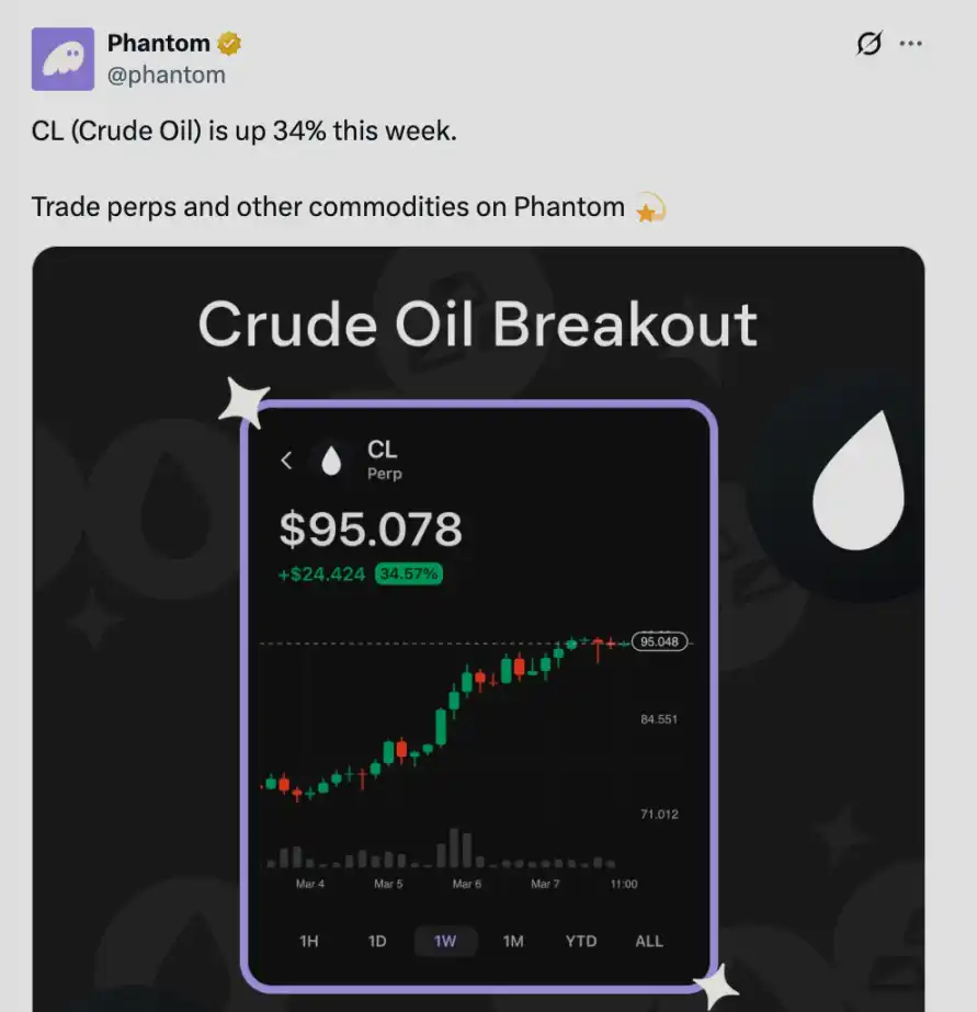 Phantom 等平台也陆续上线了原油、黄金等传统大宗商品的永续合约。理论上,任何人只需一个钱包,就可以像交易比特币一样交易原油期货,无需开立传统期货账户,无需经纪商。