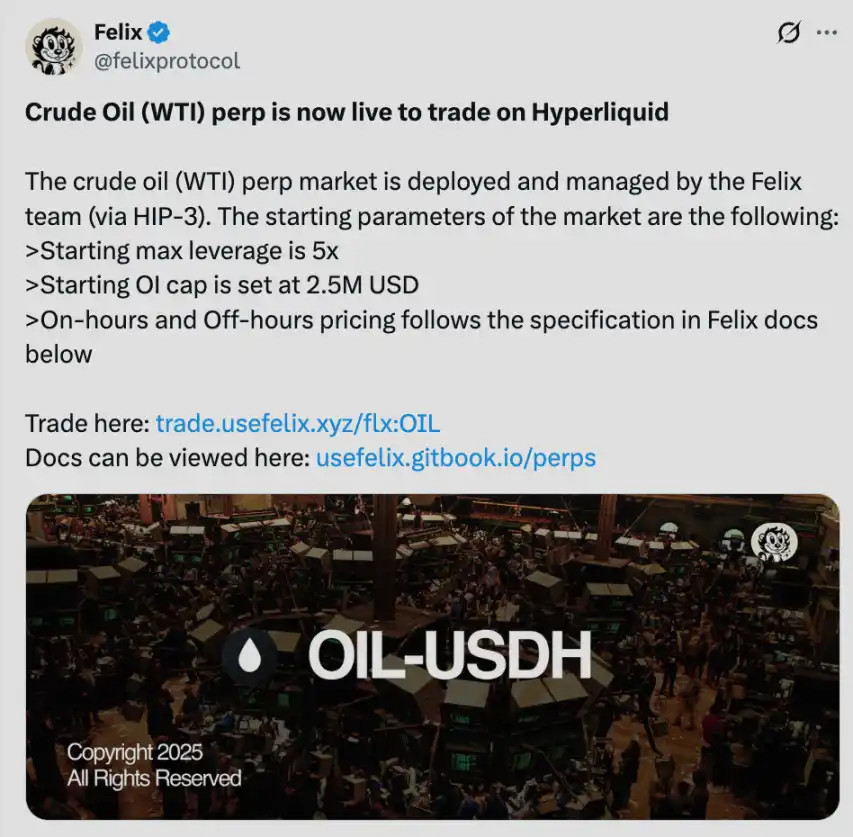 Hyperliquid 上的原油是由 Felix 协议(Hyperliquid 上的 HIP-3 市场部署方)2026 年 1 月 9 日上线的,也就是大约两个月前。初始参数是最高 5 倍杠杆、未偿付余额上限 250 万美元,属于早期小规模上线,伊朗封锁海峡之后才真正爆发交易量。
