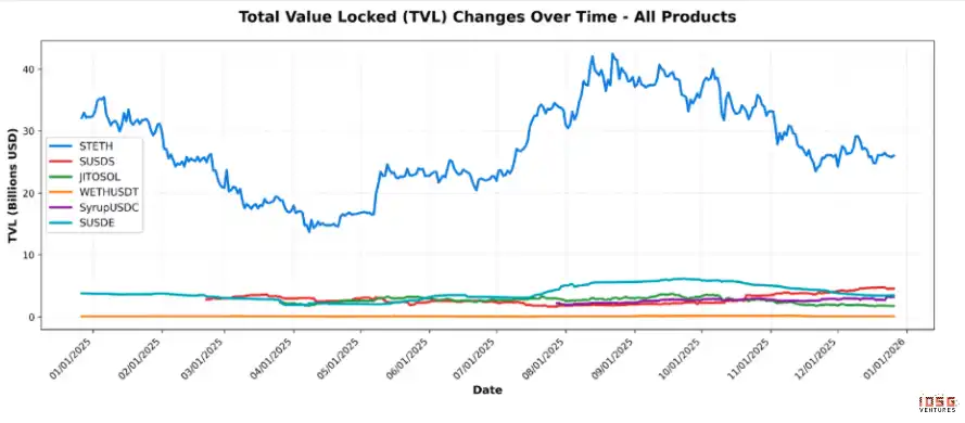 从 TVL 数据看,牛市期间所有产品的 TVL 均上涨。但在熊市中,stETH、sUSDE 和 JitoSOL 的 TVL 下降,而 sUSDS 和 SyrupUSDC 的 TVL 上升。