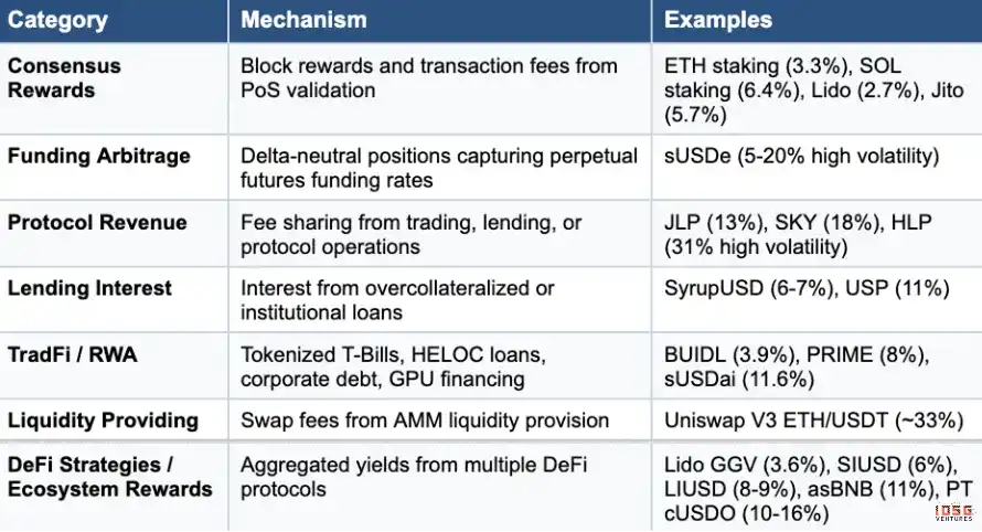 共识奖励(ETH/SOL 质押、LST)提供稳定的,协议级保障收益。资金费率套利和协议收入受市场周期影响,牛市强劲,熊市压缩。借贷和 RWA 收益引入对手盘风险但也相对稳定。LP 可以捕获交易费。DeFi 策略和生态激励聚合多个协议收益,同时也有智能合约风险。
