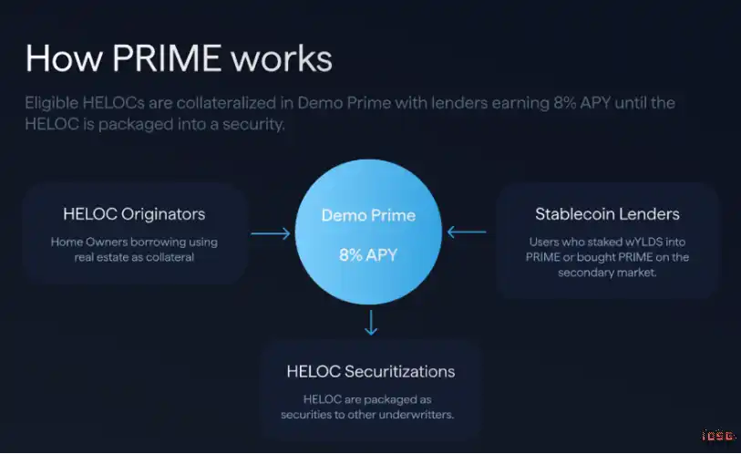这会促使稳定币将更广泛的 RWAs 资产纳入底层资产,进而使其底层资产更多元化。Figure 的 PRIME 是将 HELOC 收益上链的典型案例。HELOC(房屋净值信用额度)是一种贷款,允许房主以房屋为抵押进行借款、消费和按需还款。PRIME 代币持有者为 HELOC 贷款提供资金,固定收益率为 8%。