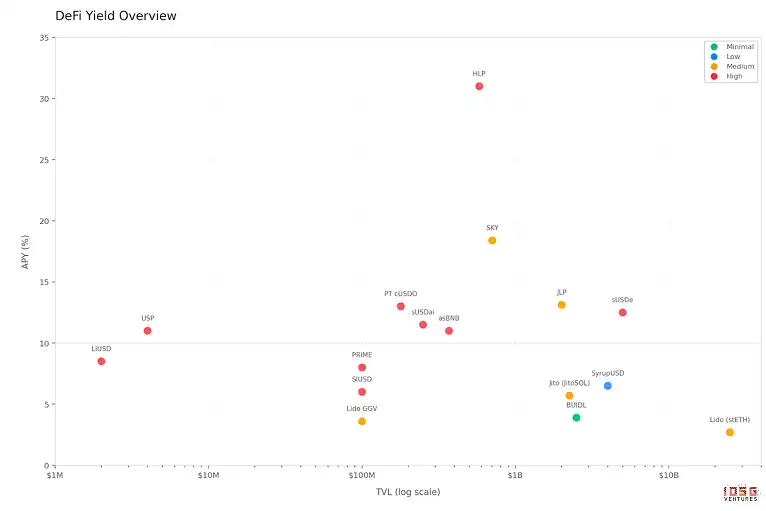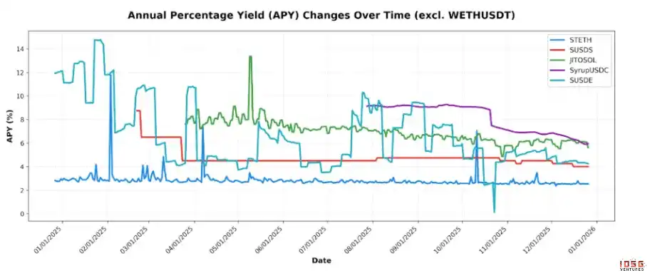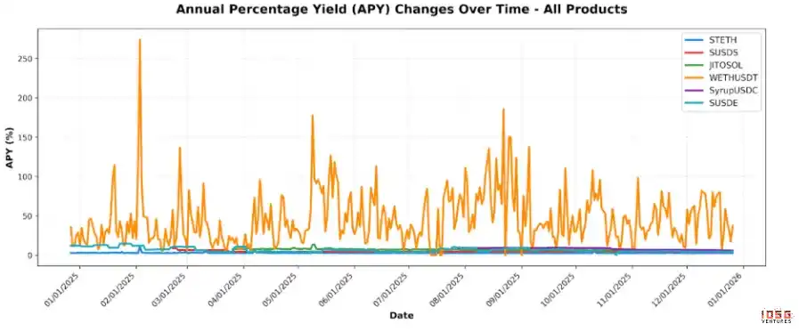 WETH/USDT 池和 stETH 的 APY 在不同市场环境下相对稳定。JitoSOL、SyrupUSDC、sUSDE 和 sUSDS 的 APY 均有所下降,其中 sUSDE 和 SyrupUSDC 降幅显著。图表还显示,APY 越高的产品波动性也越大。sUSDS 的 APY 更多由治理驱动而非市场驱动,因此大部分时间保持稳定。