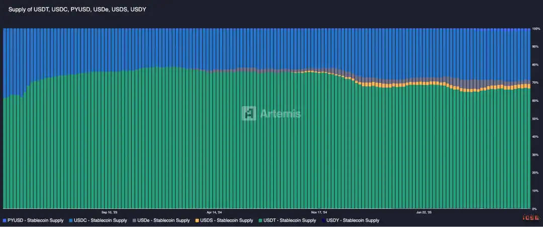 过去,通过国债 4% 的收益,稳定币是现金流极好的生意。然而,收益型稳定币是将几乎 100% 国债收益分享给用户的产品,这对传统稳定币带来一些挑战。自 2024 年以来,生息稳定币的市场份额稳步上升。如果我们看排名前三的原生收益稳定币和排名前三的无原生收益稳定币(USDT、USDC、PYUSD、USDe、USDS、USDY)的供应量,有原生收益的稳定币市场份额从 0.1% 上升至 7.6%,峰值达到 11.5%。