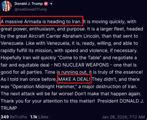 The Kobeissi Letter 将特朗普冲突模式的起点定义为口头施压。以伊朗战事为例,第一次对伊朗核设施的打击发生在 2 月 28 日,但早在两个月前,特朗普便已在 Truth Social 上多次发帖称「一支庞大的舰队正驶向伊朗」,并持续敦促伊朗「达成协议」。