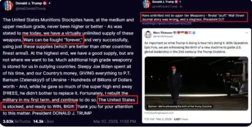 第五步:特朗普用「打得很久也行」的措辞反向刺破市场乐观。当投资者抄底后,市场往往遭到反向打击。3 月 2 日,特朗普公开表示「战争可以永远打下去」,美国拥有「无限的中高端武器」。The Kobeissi Letter 认为这种「forever」式表态更多是谈判话术,展示可承受的上限,但并不等于真想久战。