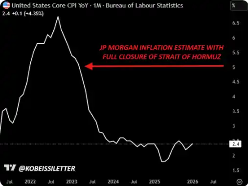 据摩根大通估算,霍尔木兹海峡封锁可能推动油价至 120 至 130 美元 / 桶,并导致美国 CPI 通胀率飙升至约 5%。该机构据此设定了三个关键监测阈值:布伦特原油持续高于 90 美元 / 桶、股市下跌 5% 或以上、汽油价格上涨逾 10%。「当这些阈值被触及,谈判相关头条新闻出现的概率将大幅上升。」