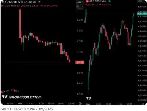 第四步:冲击出现,但市场先押注「很快谈成」。报告描述了一个常见路径:周日夜盘(美东时间 18:00)先剧烈波动,但到周一现金市场开盘前,部分走势会被「反向修正」,因为投资者默认特朗普爱做交易、冲突不会拖太久。研究以 3 月 2 日的走势举例:WTI 原油一度回吐约 70% 的涨幅,标普 500 甚至转绿,但随后这些走势又被逆转,油价创新高、股市创新低。