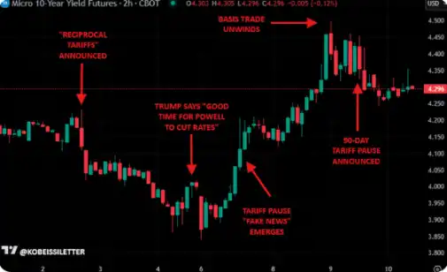 第七步为有条件降级信号出现,也是特朗普 9 日最新表态所对应的阶段。The Kobeissi Letter 强调,第六步与第七步之间的时间窗口「高度不确定」——在 2025 年初的关税战中,这一过渡历时数月,最终在 4 月 9 日关税「暂停」前,以美债收益率急速飙升作为催化剂。