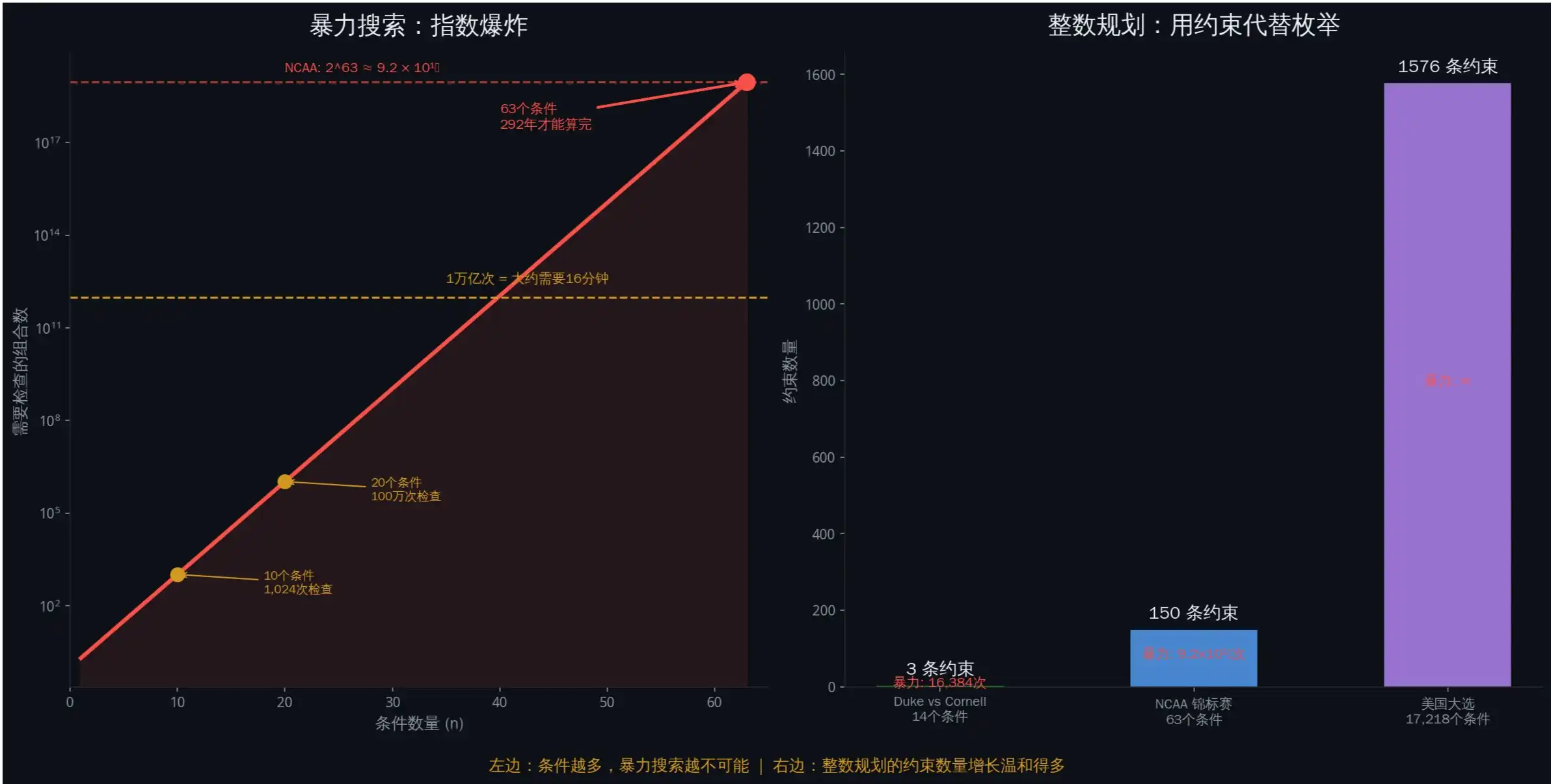 • 整数规划(Integer Programming)→ 用线性约束描述合法结果,避免暴力枚举。把 2^63 次检查压缩成几条约束 [3]
