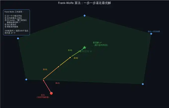 暴力方法是把每条路都走一遍。Frank-Wolfe 的方法是:先随便走一条路,然后在每个岔路口问一个「向导」(整数规划求解器):「从这里开始,哪个方向最可能通向出口?」然后朝那个方向走一步。你不需要探索整个迷宫,只需要在每个关键节点做出正确的选择。