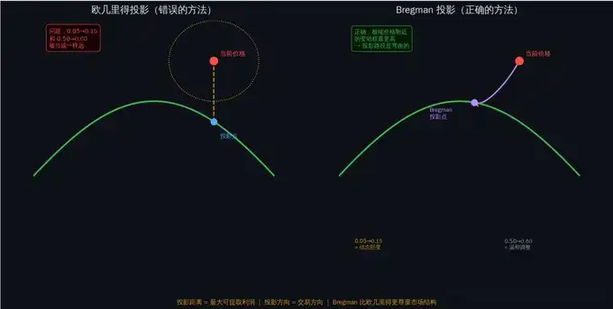 换人话说:市场价格偏离「合法空间」越远,能赚的钱越多。而 Bregman 投影会告诉你: