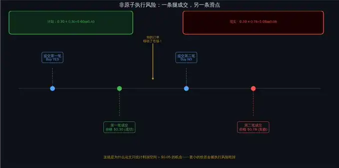 • 非原子执行 → 多笔订单不能保证同时成交的问题。一条腿成交另一条没成交 = 暴露风险