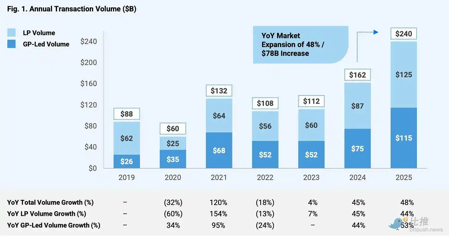 2025 年,私募次级市场交易额飙升至 2,400 亿美元,高于 2024 年的 1,620 亿美元。相比之下,全球通过传统 IPO 筹集的资金约为 1,400 亿美元。