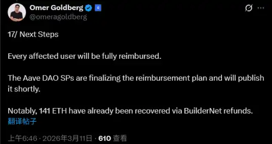 在赔付执行层面,Chaos Labs 已通过 BuilderNet 追回约 141.5 枚 ETH,结合 Aave DAO 国库补充资金,赔付上限预计约为 345 枚 ETH(约合 87 万美元),用于覆盖全部受损账户。、