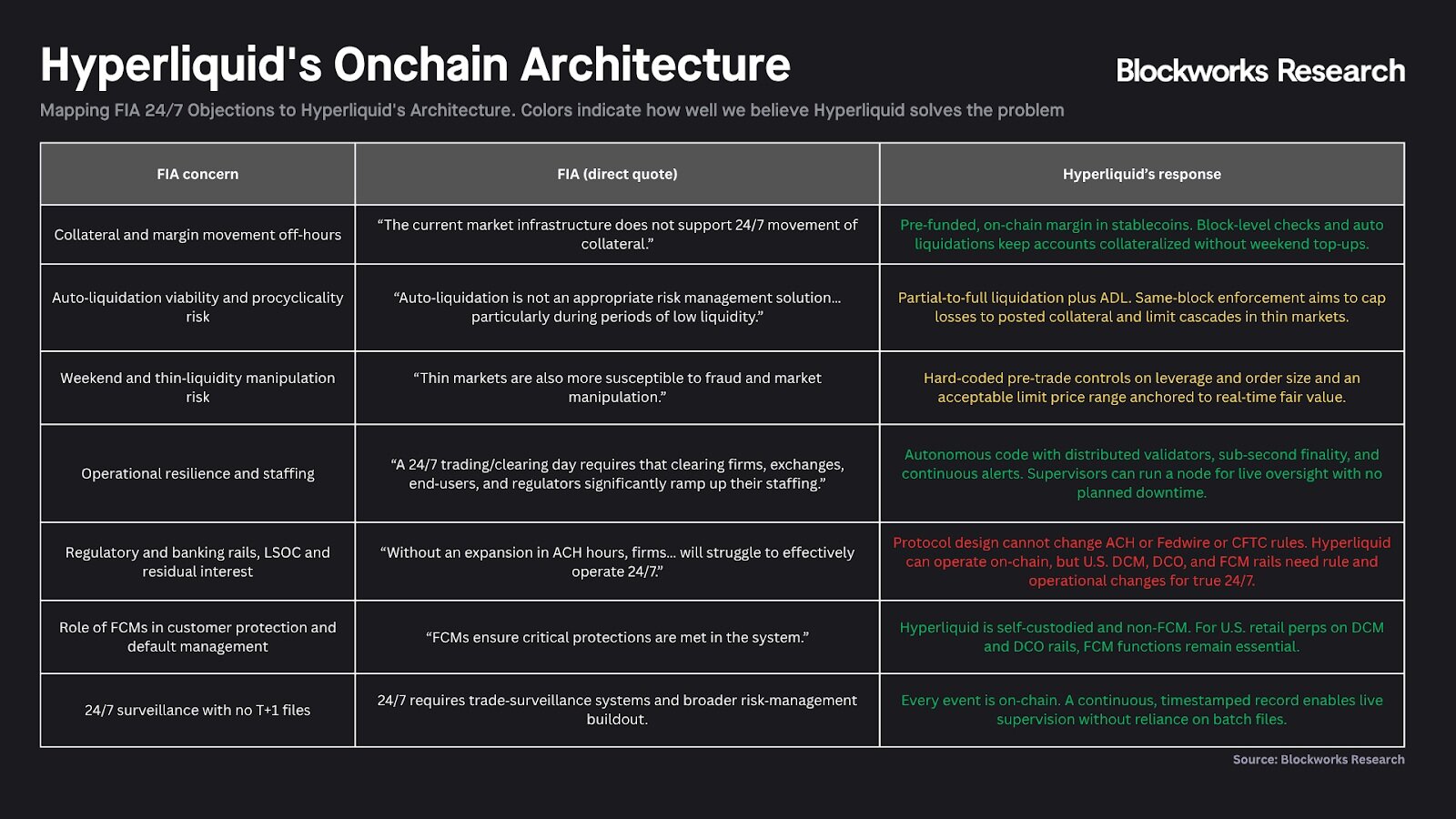 图:上图总结了 Hyperliquid 以希望成为“一个更开放、透明且高效的金融体系”来回应 CFTC 对永续合约和全天候交易的质疑。比如: 通过 24/7 自动清算协议取代了传统 DCO 对银行体系的依赖、以非托管技术剔除了臃肿的 FCM 中介、利用实时链上数据重构 DCM 的监管逻辑等方面说明利用区块链技术能够直接跨越传统金融的物理时差与效率瓶颈。