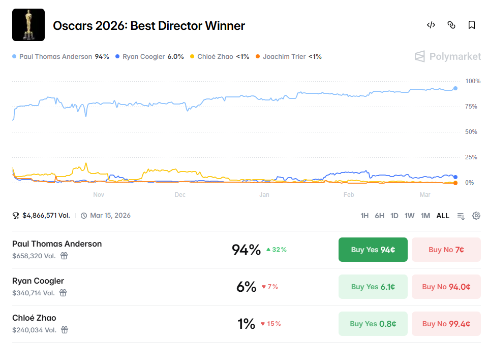 Polymarket 对应事件:Oscars 2026: Best Director Winner,交易量近 500 万美元;