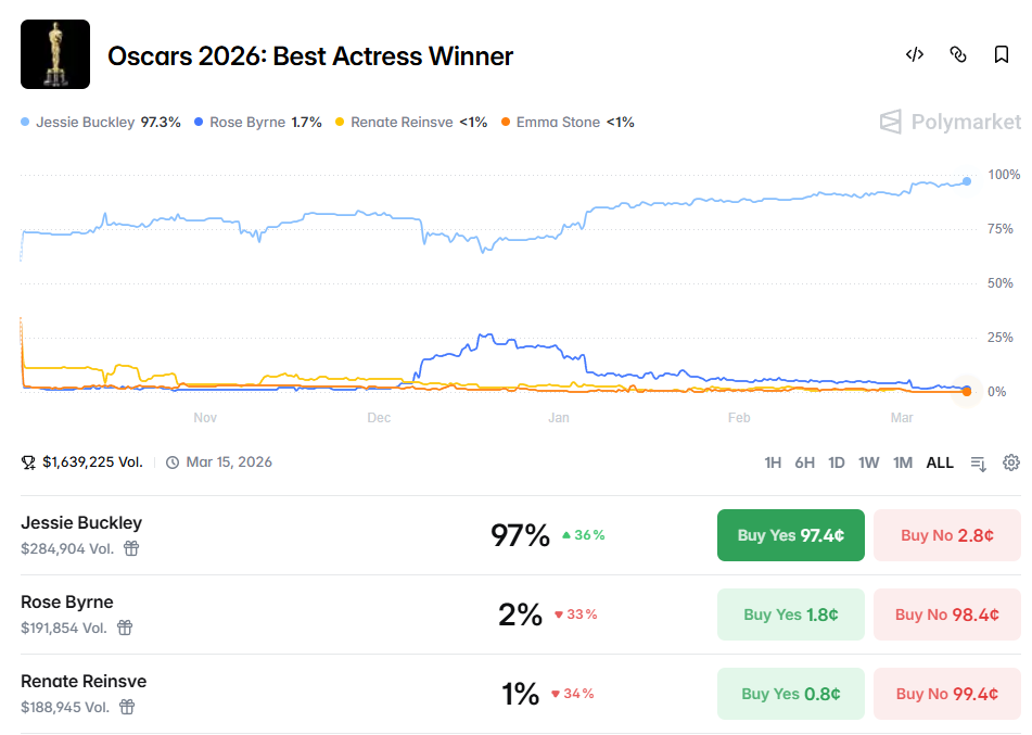 Polymarket 对应事件:Oscars 2026: Best Actress Winner,交易量超 150 万美元;