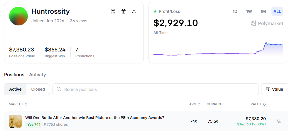 仅持仓“一战再战”单一事件地址:0x8f49c70ce8e353c0531d39f5448f0ba5f561bf8d,该地址 5 日前以 74 美分均价买入近 10000 份 YES 仓位,当前仅持仓“一战再战”将获得最佳影片奖单一事件。