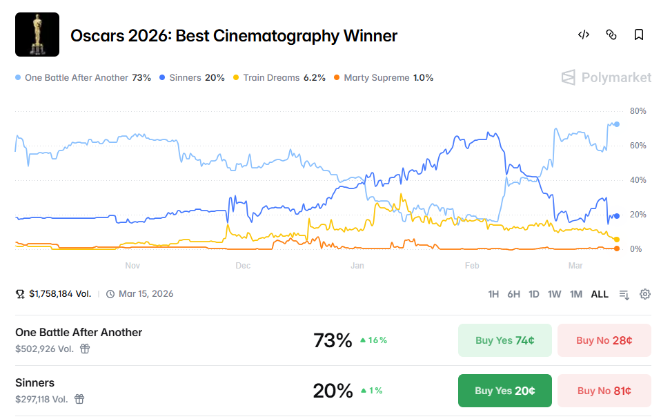 三、最佳摄影奖(链接:https://polymarket.com/event/oscars-2026-best-cinematography-winner),一战再战(One Battle After Another) 以 73%的实时赔率暂居第一;Sinners 排名第二,概率为 20%。