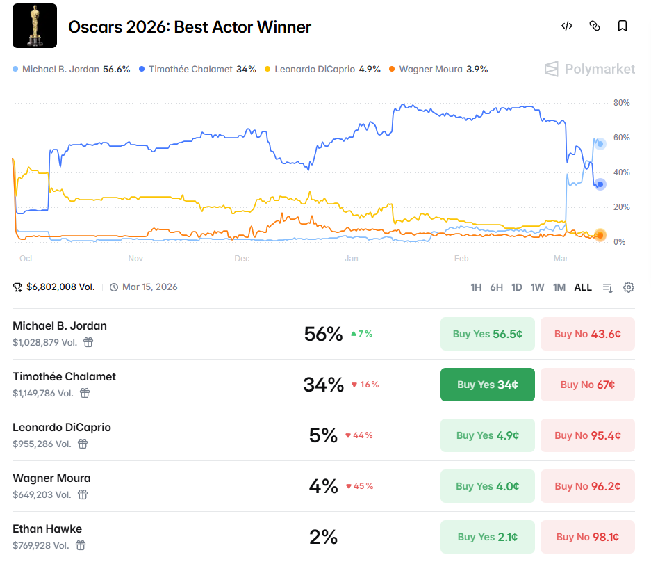 Polymarket 对应事件:Oscars 2026: Best Actor Winner,交易量近 700 万美元;