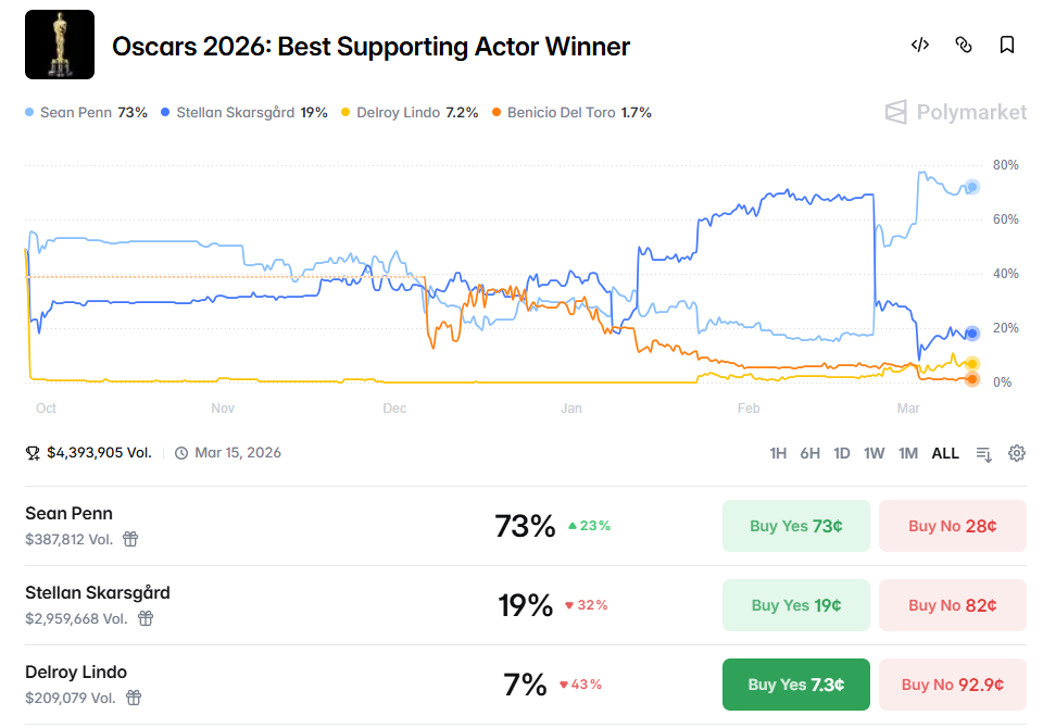 二、最佳男配角奖(链接:https://polymarket.com/event/oscars-2026-best-supporting-actor-winner),Sean Penn 以 73%的实时赔率暂居第一;Stellan Skarsgård 排名第二,概率为 19%;Delroy Lindo 排名第三,概率为 7%。