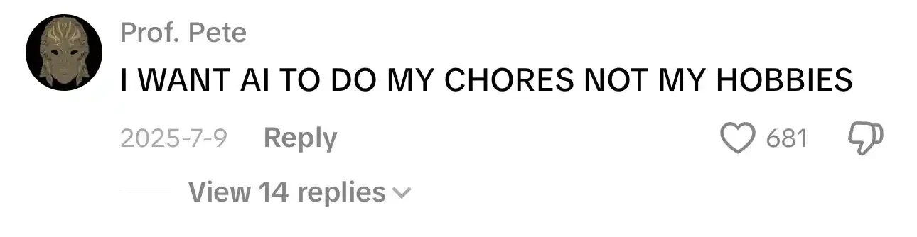 如果你想感受一下当下的时代情绪,有一个地方特别值得去看看:TikTok 的评论区。当你开始读 TikTok 的评论时,你会一遍又一遍地注意到一种情绪:一种尖锐、强烈、几乎是本能般的对 AI 的仇恨。
