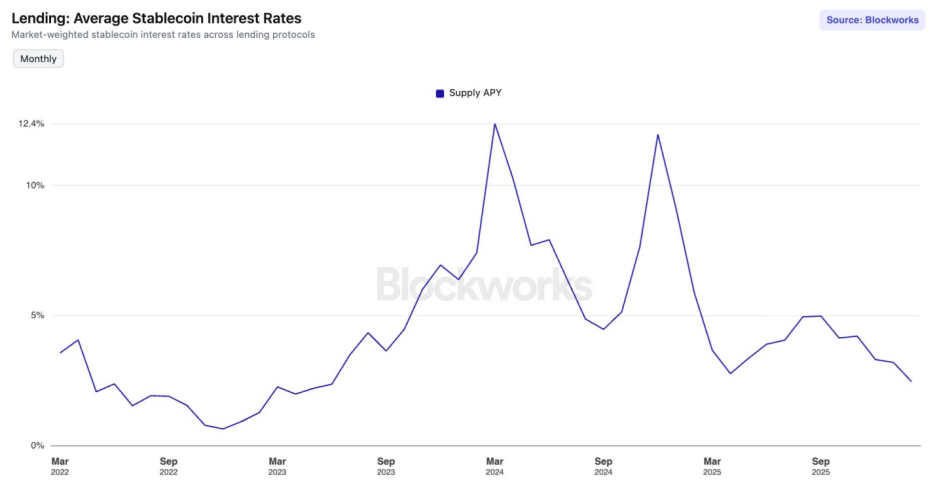 从2025年9月起,DeFi(去中心化金融)市场就进入了“利率寒冬”。主流稳定币在头部借贷协议中的平均存款年化收益率(APY)触及了自2023年6月以来的最低水平。
