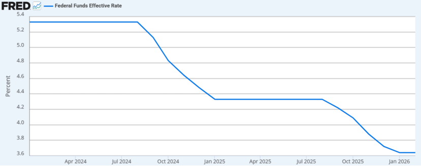 自2024年1月起,美联储联邦基金有效利率始终保持在3.6%以上的水平。尽管市场预期未来会有温和的降息路径,但目前的实际利率依然维持在相对高位。