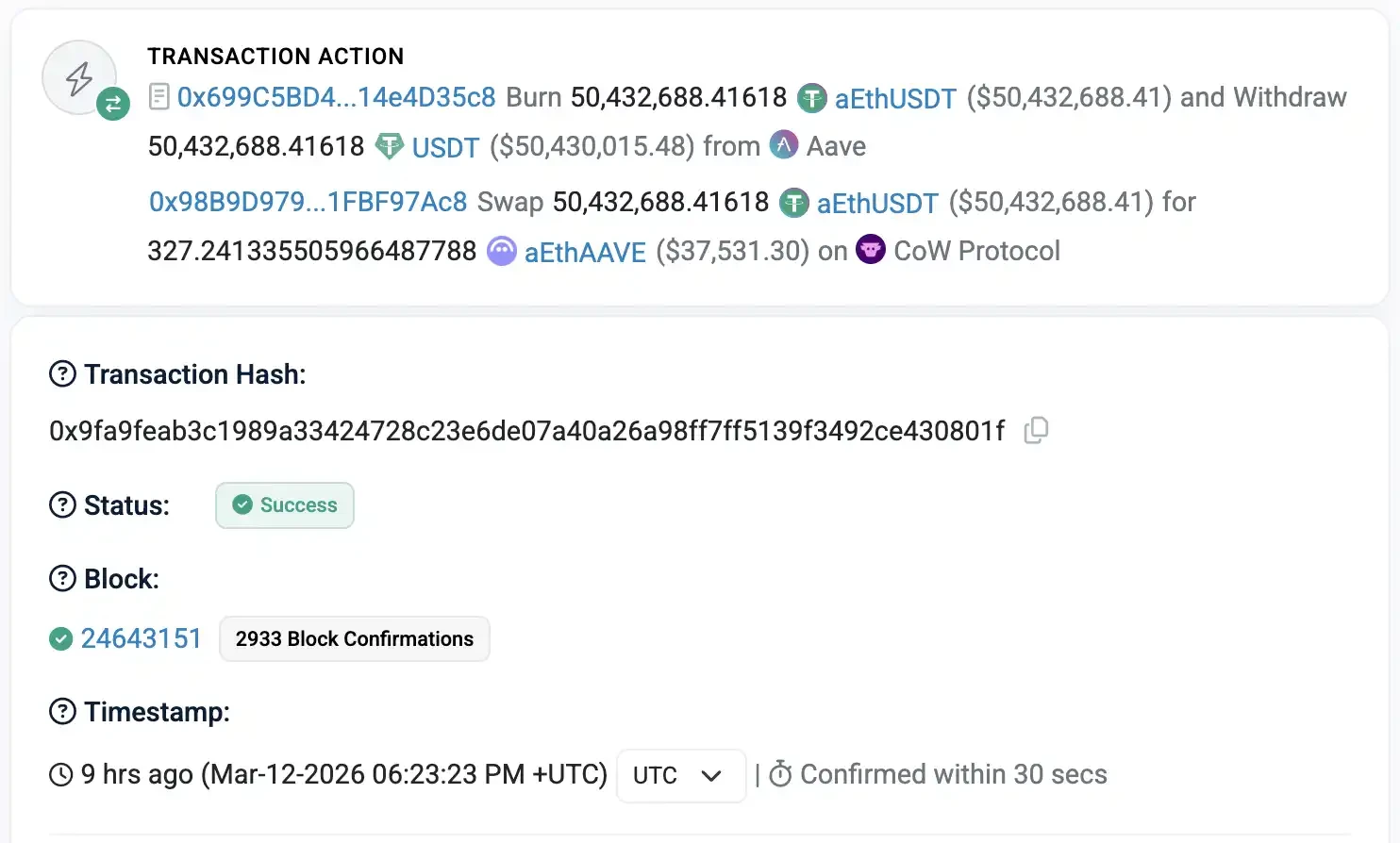 第一步,用户在 Aave V3 上持有的 aEthUSDT(生息 USDT 凭证)被赎回为 5043 万枚 USDT。这一步是协议内部的赎回操作,资金完整到账,没有任何损失。