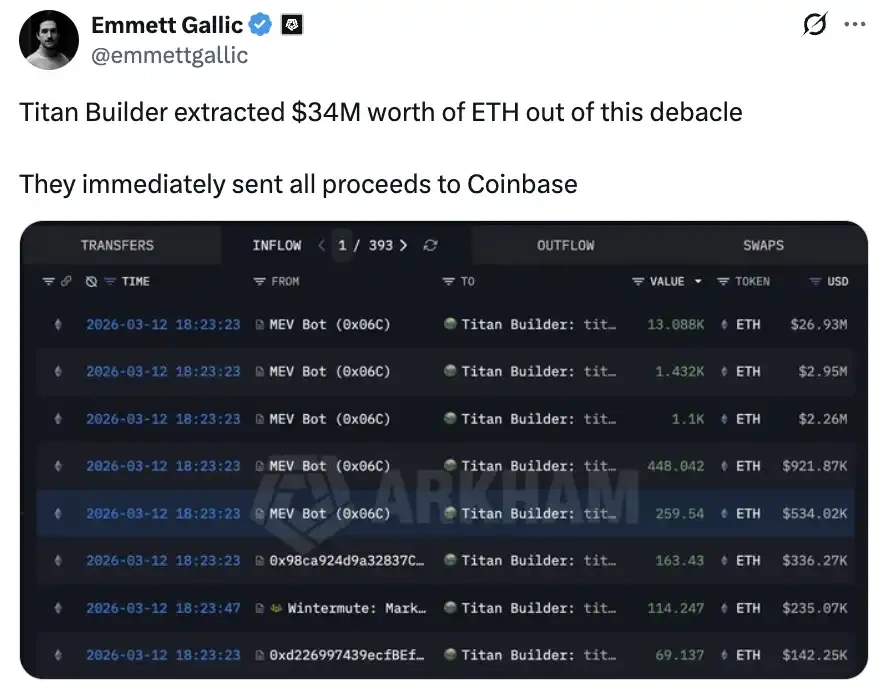 吃到最大一块肉的是以太坊区块构建者 Titan Builder,约 3400 万美元。链上分析师 @emmettgallic 追踪发现,Titan 从这笔交易所在的区块中提取了这笔巨额 ETH,并在区块确认后立即将全部所得转入 Coinbase。