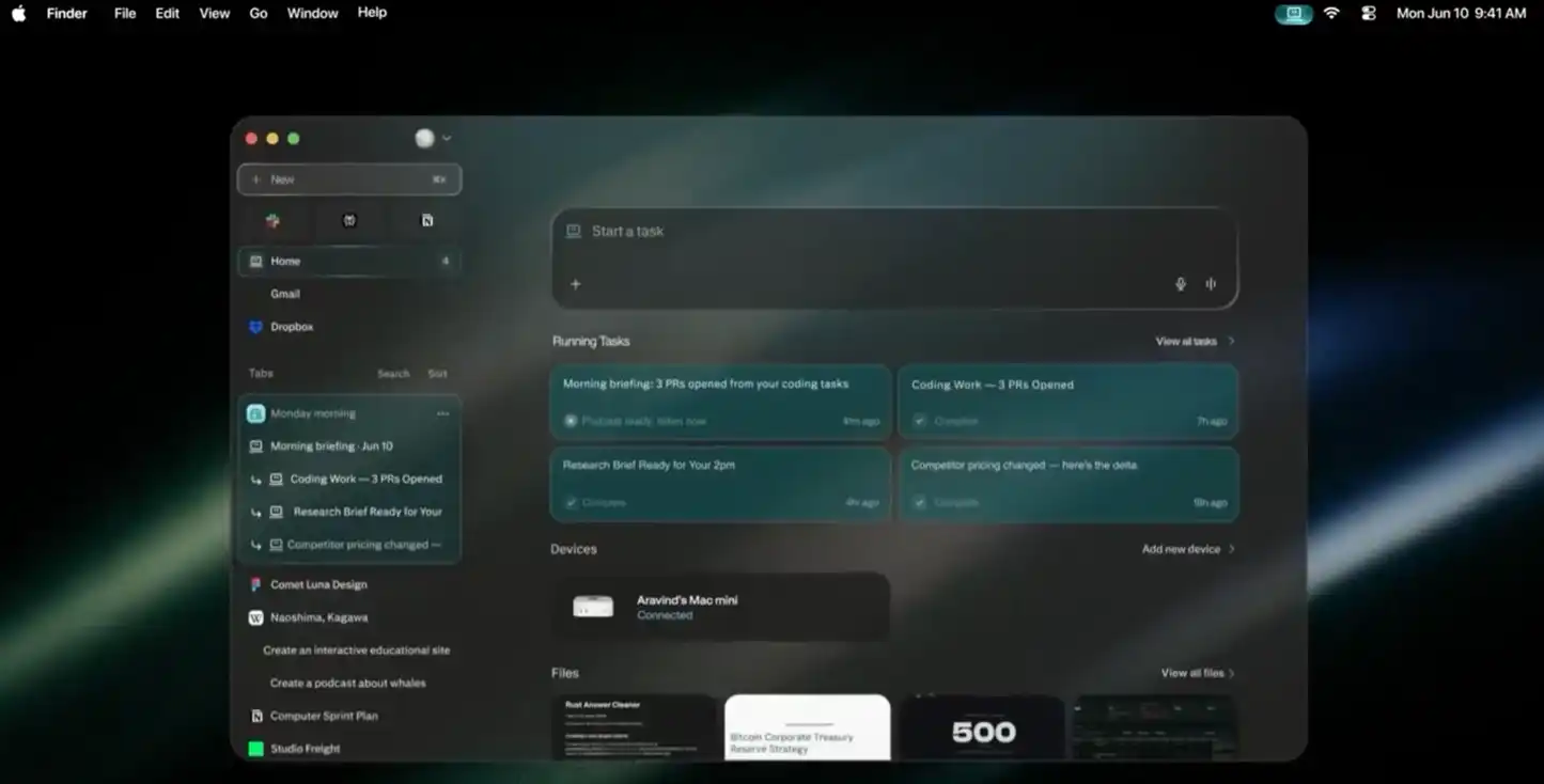 根据 Perplexity 的说法,Personal Computer 是一款结合 Perplexity Computer、全天候运行在本地(Mac Mini)的 AI 助手。它能够访问 Mac Mini 本地的文件、App 以及会话,因此也能够实现在设备下达一个指令,然后 AI 跨文件、App,结合所有本地数据来完成任务的模式。