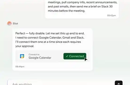 通过浏览器来使用 Superagents,将需要处理的 App 账号连接到 Superagents 上(如 Google 全家桶、Whatsapp、Telegram、Slack 等等),Superagents 就能够自主根据用户的任务安排进行工作。