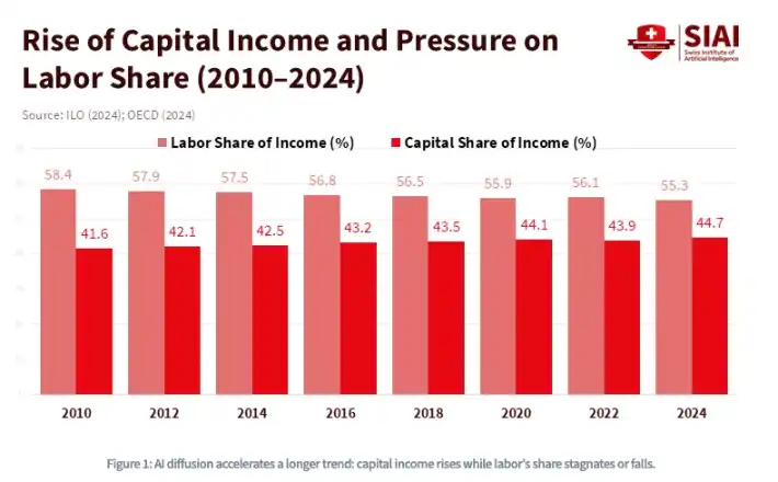 然而,马克思在分析中存在一个关键错误:他认为资本本身天然缺乏活力,必须持续消耗人类劳动才能盈利。但随着信贷的崛起,如今又迎来人工智能的爆发,我们即将进入一个全新的范式——「吸血鬼」不仅完全具有能动性,甚至能绕过人类劳动,仅需持续消耗动能就能盈利。如下图所示,十多年来,资本收入占比持续上升、劳动收入占比不断下降的趋势早已酝酿,而人工智能将推动这一趋势越过不可逆转的拐点。