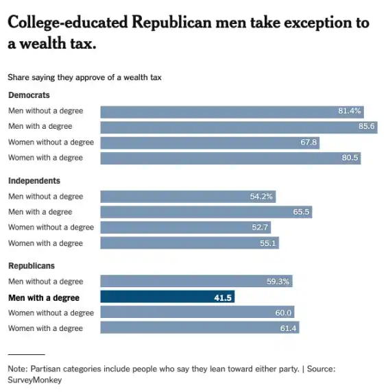 看看资本主义的发源地与最后堡垒——美国。《纽约时报》关于公众对财富税态度的民调显示,除大学学历男性(这一群体人口正快速萎缩)外,所有人口群体对财富税的支持率几乎一致。