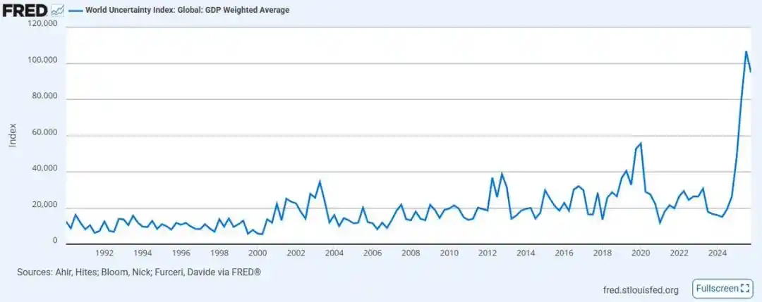 国际货币基金组织构建的全球不确定性指数(IMF)近期创下 2008 年创立以来的最高水平。政策与贸易领域缺乏明确的方向性和协同性,自此前历史高点以来,市场情绪已显著恶化,且这一趋势大概率还会进一步加剧——尤其是在中东地区,原本摇摇欲坠的旧有全球联盟正被卷入一场前所未有的冲突。
