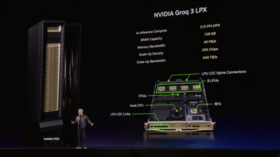 我们收购了 Groq 团队并获得其技术授权。Groq 是一种确定性数据流处理器(Deterministic Dataflow Processor),采用静态编译和编译器调度,拥有大量 SRAM,专为推理单一工作负载优化,具备极低延迟和极高 token 生成速度。