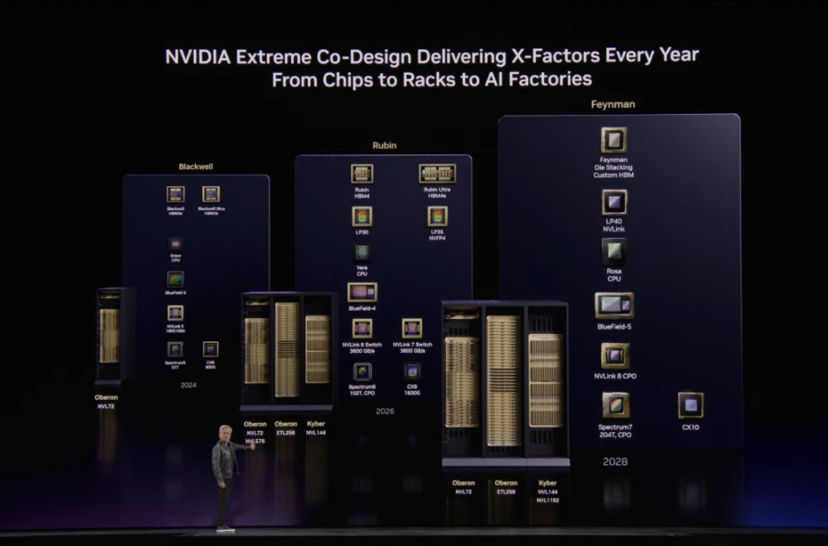 - Feynman(下一代):全新 GPU,LP40 芯片(由英伟达与 Groq 团队联合打造,集成 NVFP4);全新 CPU——Rosa(Rosalyn);BlueField 5;CX 10;同时支持铜缆和 CPO 两种扩展方式的 Kyber 机架