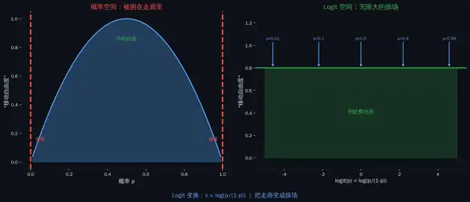 · Logit 变换 → x = log(p/(1-p)),把 0-1 的概率映射到整条数轴。让你可以在无界空间里使用传统数学工具 [1]