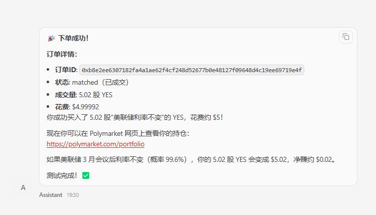 从发现机会到完成下单,整个流程都在 OpenClaw 里完成,不需要切换页面,也不用忍受经常卡顿的 Polymarket 前端了。