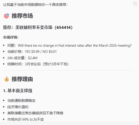 它推过来一个市场:「美联储 3 月会议后利率是否不变」,当前 YES 报价 $0.99,24 小时成交量 $2.4M,市场共识 99% 认为不变。基本面也支撑这个判断:通胀数据稳定,经济增长温和,美联储近期态度偏鸽派但不急于降息。