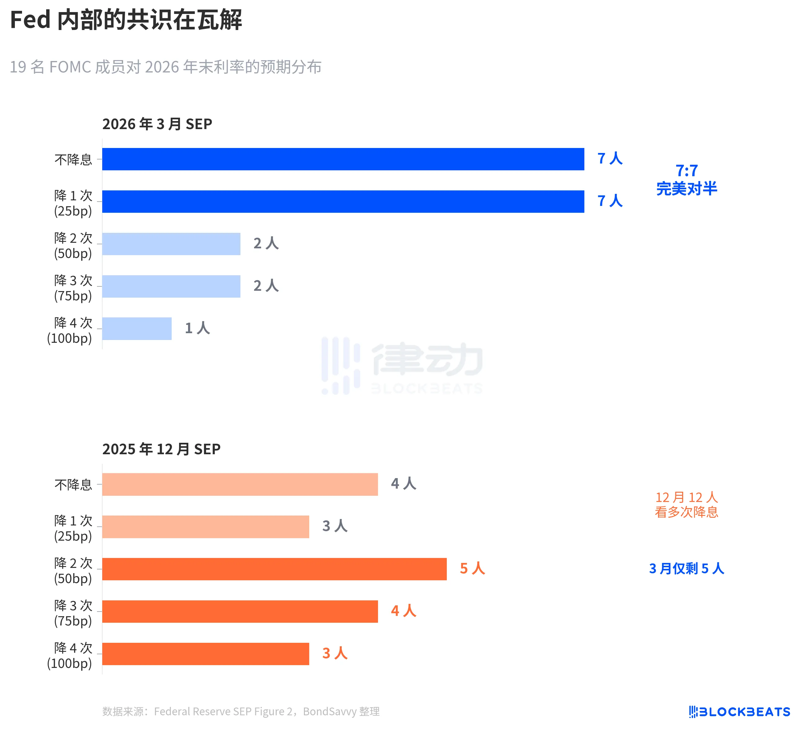 据美联储 3 月 SEP Figure 2 点阵图(BondSavvy 整理),19 名参与者对 2026 年末利率的投票分布是:7 人不降息,7 人降 1 次,2 人降 2 次,2 人降 3 次,1 人降 4 次。