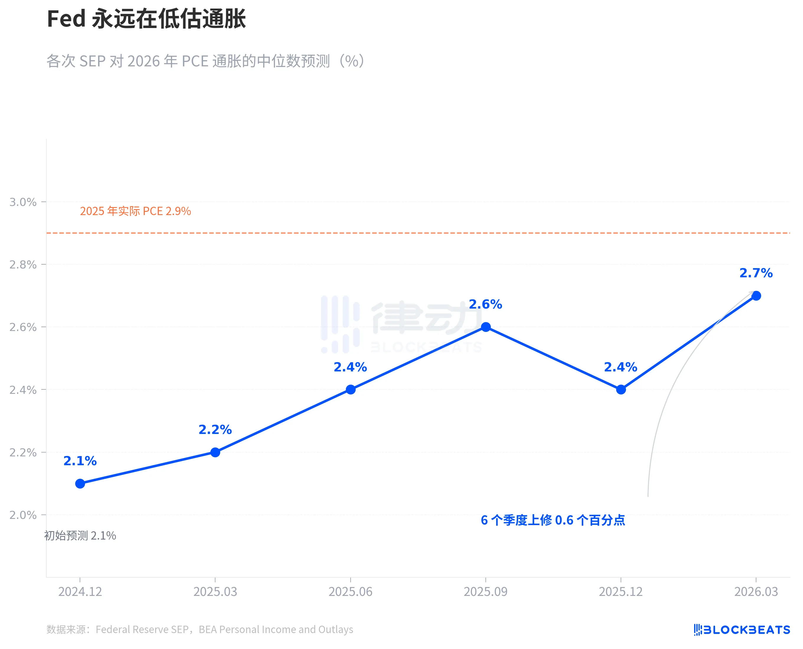 这个模式不是第一次出现。2025 年的 PCE 通胀走了一模一样的路。2024 年 12 月美联储预测 2025 年 PCE 为 2.5%,此后逐季上修至 2.7%、3.0%、3.0%、2.9%。据美国经济分析局(BEA)数据,2025 年 12 月实际 PCE 同比为 2.9%。美联储花了一整年追赶,最后一期才勉强追平。