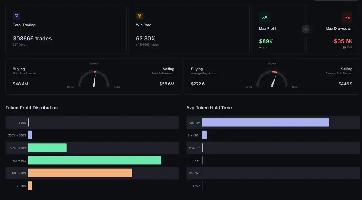 这种堪称「印钞机」的盈利能力,对应的 357 天内总计 308666 笔交易,胜率为 62.3%,以及仅仅 7 秒的持仓时间中位值。