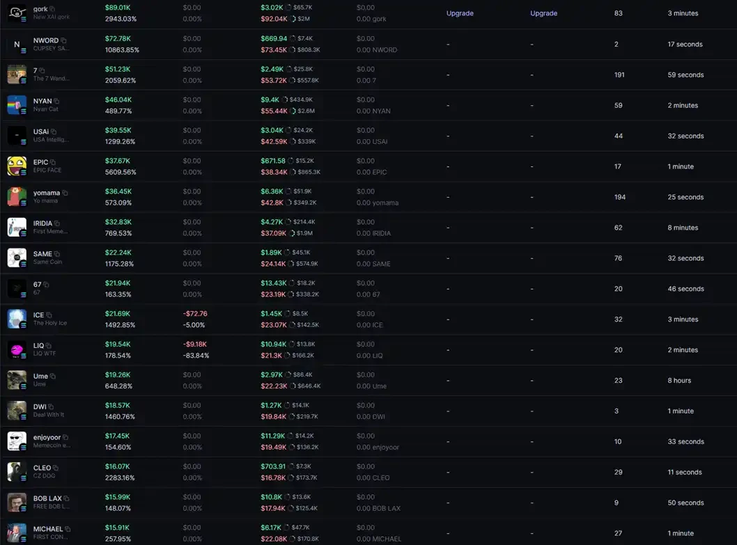 他的千万美元盈利,没有一笔是来自钻石手的「大结果」,最大的单笔盈利来自 $gork,也仅仅斩获了约 9 万美元利润。而在下面的盈利币种排名中,他赚的很多钱,炒的都是我们可能听都没听说过的币。