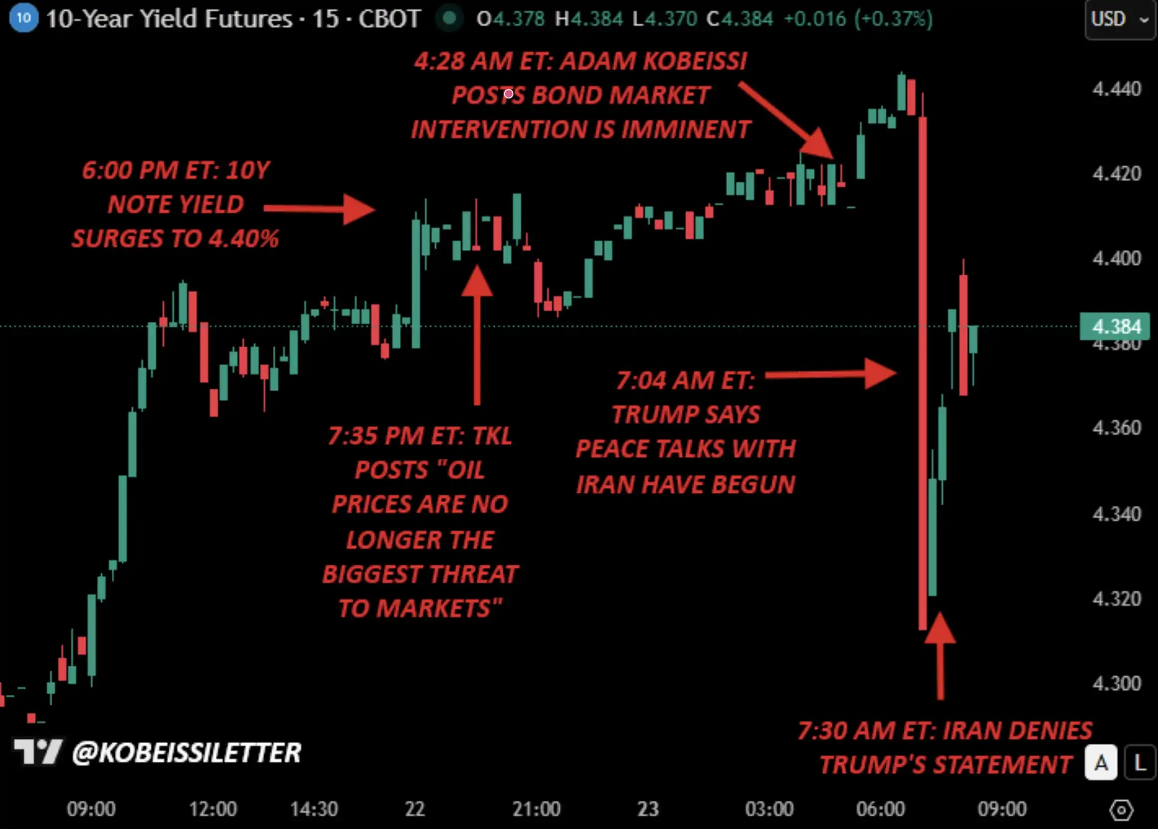 美东时间 3 月 23 日凌晨 4:30,我们曾指出:相比能源市场,债券市场的问题已经更加「失序」。随后,仅过了 2 小时,10 年期美债收益率升至 4.45%,特朗普总统很可能进行了类似 2025 年 4 月 9 日那样的决策讨论——当时他宣布暂停关税 90 天。