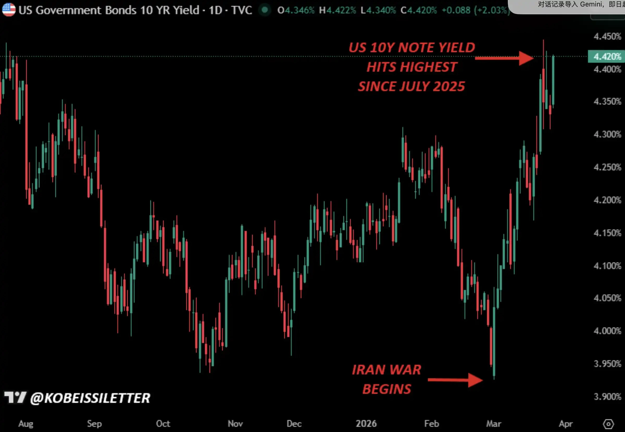 如下所示,自伊朗战争爆发以来的 27 天内,美国 10 年期国债收益率已从约 3.92% 上升至 4.42%,累计上行 50 个基点。要知道,在战争爆发前,市场讨论的焦点还在于:2026 年究竟会降息多少次。