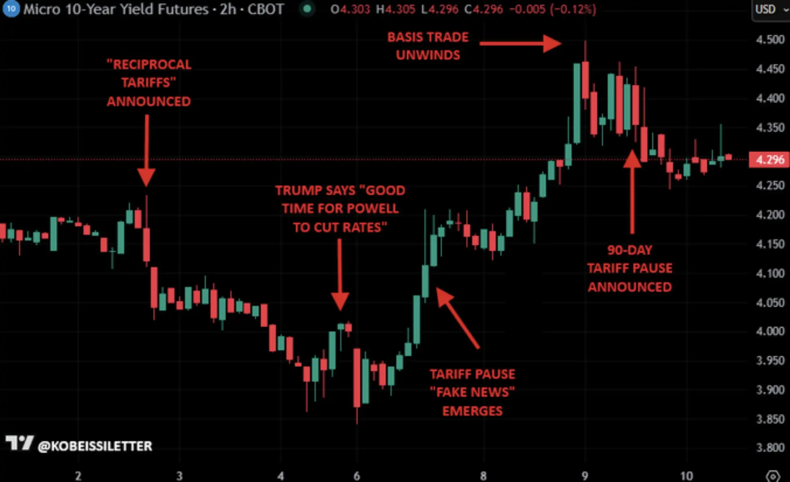 在下图中,我们梳理了所谓「解放日」(Liberation Day)期间,美国国债收益率上行的完整时间线,也正是这一轮收益率飙升,最终促成了 4 月 9 日的政策转向,从而缓解了市场压力。